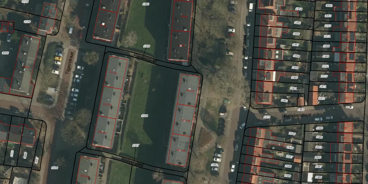 Het perceel waarop Wolfstraat 100 staat heeft een oppervlakte van 3015 m². Dit is een zeer groot perceel. De perceeloppervlakte wordt geregistreerd door het Kadaster. Gedetailleerde informatie over de maten van dit perceel kunt u vinden in het rapport Kadastrale kaart met maatvoering van Wolfstraat 100.