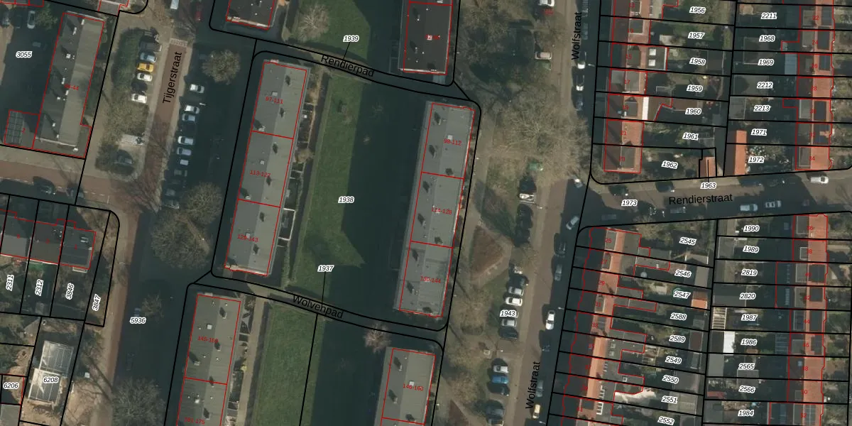 Het perceel waarop Wolfstraat 114 staat heeft een oppervlakte van 3015 m². Dit is een zeer groot perceel. De perceeloppervlakte wordt geregistreerd door het Kadaster. Gedetailleerde informatie over de maten van dit perceel kunt u vinden in het rapport Kadastrale kaart met maatvoering van Wolfstraat 114.