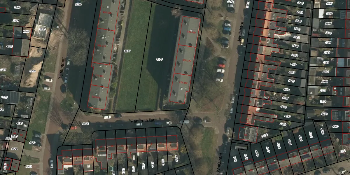 Het perceel waarop Wolfstraat 192 staat heeft een oppervlakte van 1780 m². Dit is een zeer groot perceel. De perceeloppervlakte wordt geregistreerd door het Kadaster. Gedetailleerde informatie over de maten van dit perceel kunt u vinden in het rapport Kadastrale kaart met maatvoering van Wolfstraat 192.