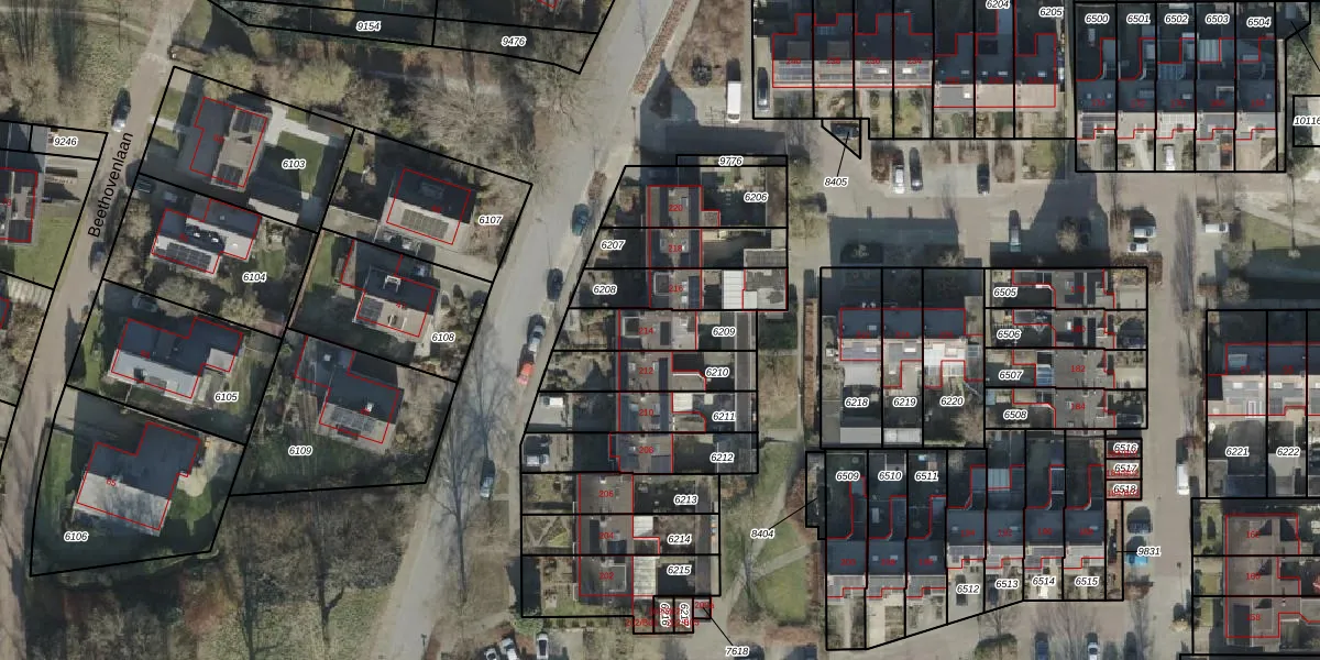 Het perceel waarop Beethovenlaan 214 staat heeft een oppervlakte van 187 m². Dit is een middelgroot perceel. De perceeloppervlakte wordt geregistreerd door het Kadaster. Gedetailleerde informatie over de maten van dit perceel kunt u vinden in het rapport Kadastrale kaart met maatvoering van Beethovenlaan 214.