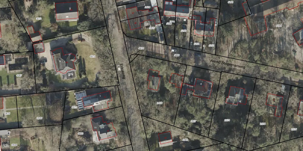 Het perceel waarop Ericaweg 41 staat heeft een oppervlakte van 1210 m². Dit is een zeer groot perceel. De perceeloppervlakte wordt geregistreerd door het Kadaster. Gedetailleerde informatie over de maten van dit perceel kunt u vinden in het rapport Kadastrale kaart met maatvoering van Ericaweg 41.