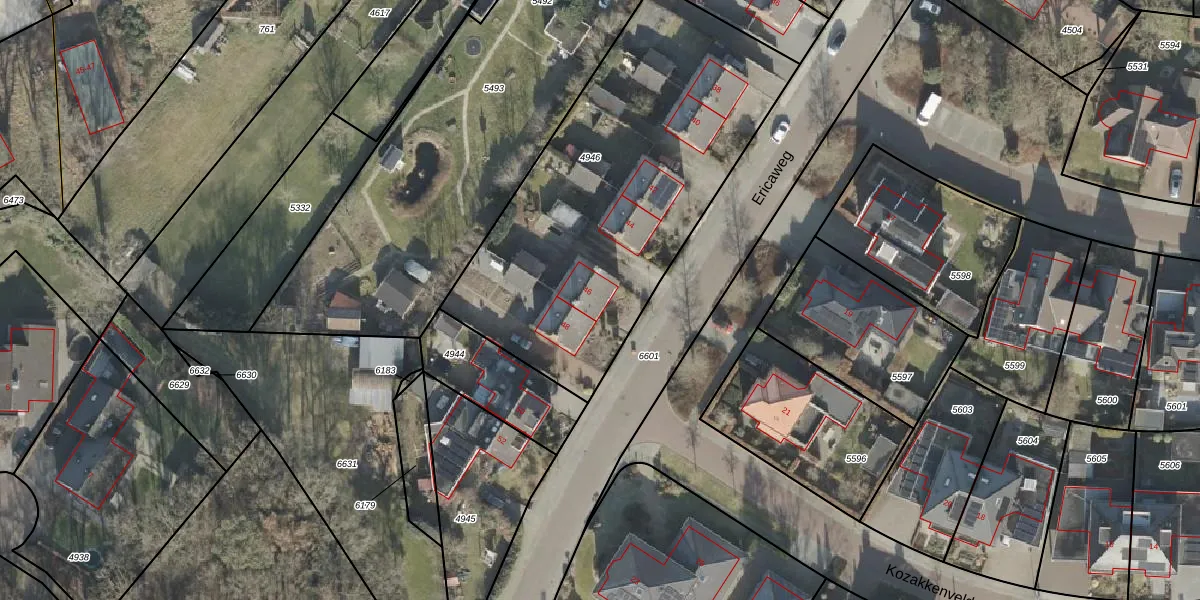 Het perceel waarop Ericaweg 46 staat heeft een oppervlakte van 1880 m². Dit is een zeer groot perceel. De perceeloppervlakte wordt geregistreerd door het Kadaster. Gedetailleerde informatie over de maten van dit perceel kunt u vinden in het rapport Kadastrale kaart met maatvoering van Ericaweg 46.