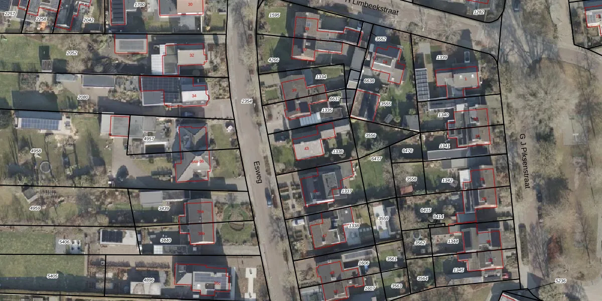 Esweg 43 is gelegen op kadastraal perceel HLD01L1336. Deze kadastrale aanduiding is uniek en wordt gebruikt door het Kadaster om eigendomsrechten en andere zakelijke rechten vast te leggen. Het perceel maakt onderdeel uit van de kadastrale gemeente Hellendoorn.