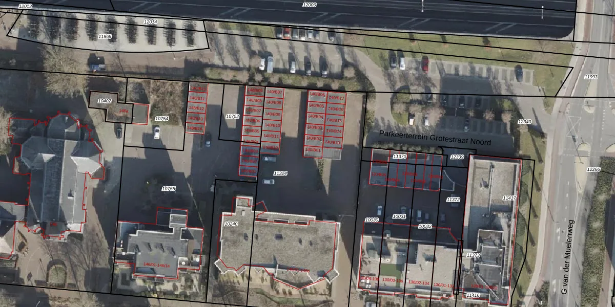 Het perceel waarop Grotestraat 140-B01 staat heeft een oppervlakte van 2400 m². Dit is een zeer groot perceel. De perceeloppervlakte wordt geregistreerd door het Kadaster. Gedetailleerde informatie over de maten van dit perceel kunt u vinden in het rapport Kadastrale kaart met maatvoering van Grotestraat 140-B01.