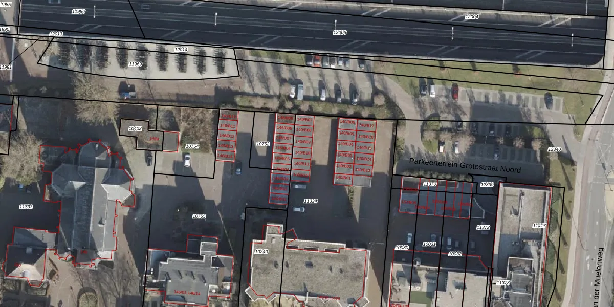 Het perceel waarop Grotestraat 140-B10 staat heeft een oppervlakte van 2400 m². Dit is een zeer groot perceel. De perceeloppervlakte wordt geregistreerd door het Kadaster. Gedetailleerde informatie over de maten van dit perceel kunt u vinden in het rapport Kadastrale kaart met maatvoering van Grotestraat 140-B10.