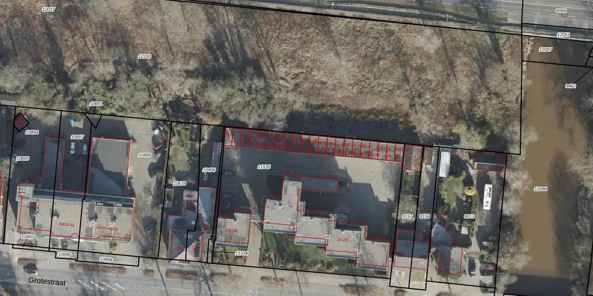 Het perceel waarop Grotestraat 16-B159 staat heeft een oppervlakte van 2772 m². Dit is een zeer groot perceel. De perceeloppervlakte wordt geregistreerd door het Kadaster. Gedetailleerde informatie over de maten van dit perceel kunt u vinden in het rapport Kadastrale kaart met maatvoering van Grotestraat 16-B159.
