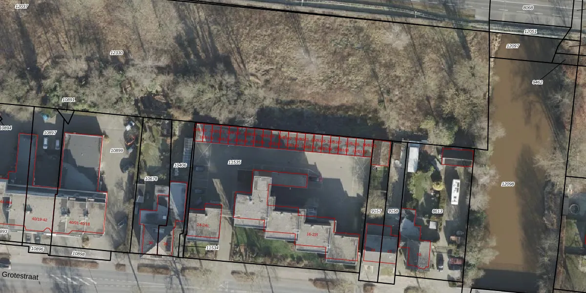 Het perceel waarop Grotestraat 16-B162 staat heeft een oppervlakte van 2772 m². Dit is een zeer groot perceel. De perceeloppervlakte wordt geregistreerd door het Kadaster. Gedetailleerde informatie over de maten van dit perceel kunt u vinden in het rapport Kadastrale kaart met maatvoering van Grotestraat 16-B162.