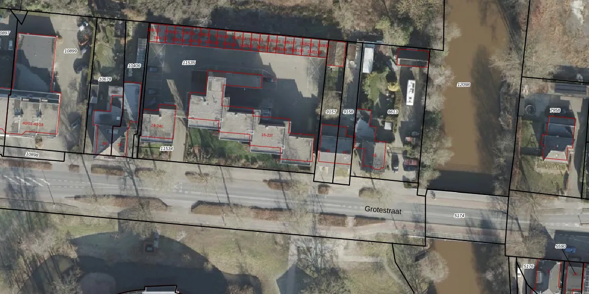 Het perceel waarop Grotestraat 16-a staat heeft een oppervlakte van 2772 m². Dit is een zeer groot perceel. De perceeloppervlakte wordt geregistreerd door het Kadaster. Gedetailleerde informatie over de maten van dit perceel kunt u vinden in het rapport Kadastrale kaart met maatvoering van Grotestraat 16-a.