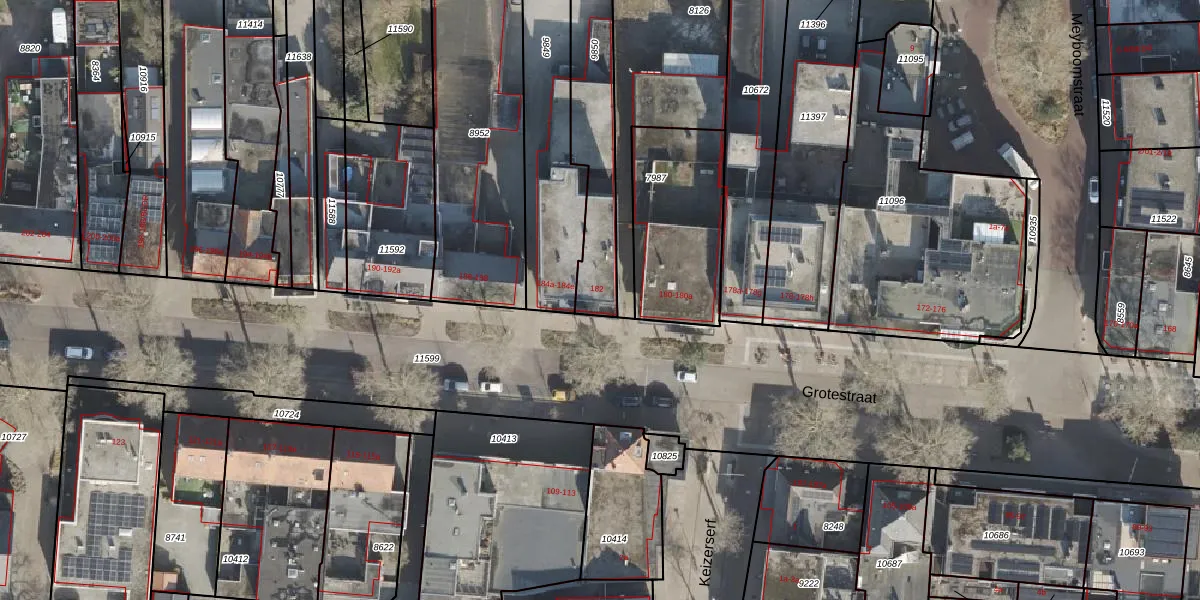 Het perceel waarop Grotestraat 182 staat heeft een oppervlakte van 408 m². Dit is een groot perceel. De perceeloppervlakte wordt geregistreerd door het Kadaster. Gedetailleerde informatie over de maten van dit perceel kunt u vinden in het rapport Kadastrale kaart met maatvoering van Grotestraat 182.