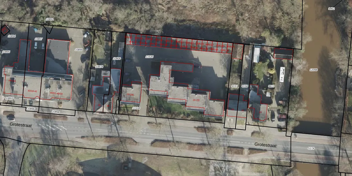 Het perceel waarop Grotestraat 20-e staat heeft een oppervlakte van 2772 m². Dit is een zeer groot perceel. De perceeloppervlakte wordt geregistreerd door het Kadaster. Gedetailleerde informatie over de maten van dit perceel kunt u vinden in het rapport Kadastrale kaart met maatvoering van Grotestraat 20-e.