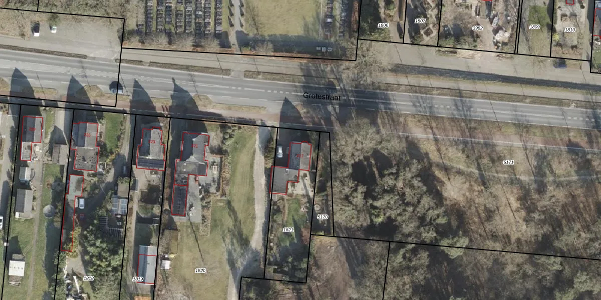 Het perceel waarop Grotestraat 217 staat heeft een oppervlakte van 707 m². Dit is een groot perceel. De perceeloppervlakte wordt geregistreerd door het Kadaster. Gedetailleerde informatie over de maten van dit perceel kunt u vinden in het rapport Kadastrale kaart met maatvoering van Grotestraat 217.