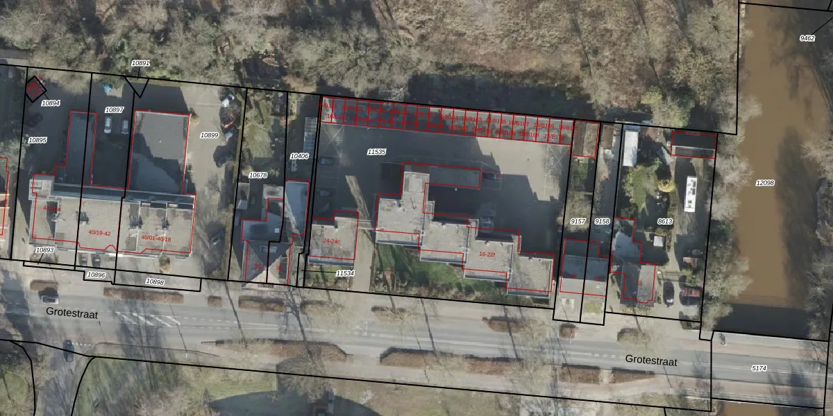 Het perceel waarop Grotestraat 22-c staat heeft een oppervlakte van 2772 m². Dit is een zeer groot perceel. De perceeloppervlakte wordt geregistreerd door het Kadaster. Gedetailleerde informatie over de maten van dit perceel kunt u vinden in het rapport Kadastrale kaart met maatvoering van Grotestraat 22-c.