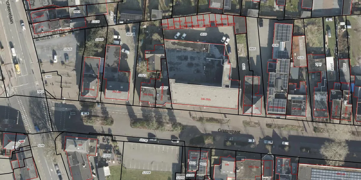 Het perceel waarop Grotestraat 252-b staat heeft een oppervlakte van 2150 m². Dit is een zeer groot perceel. De perceeloppervlakte wordt geregistreerd door het Kadaster. Gedetailleerde informatie over de maten van dit perceel kunt u vinden in het rapport Kadastrale kaart met maatvoering van Grotestraat 252-b.