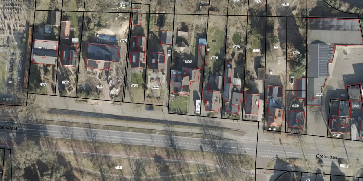 Het perceel waarop Grotestraat 318 staat heeft een oppervlakte van 1025 m². Dit is een zeer groot perceel. De perceeloppervlakte wordt geregistreerd door het Kadaster. Gedetailleerde informatie over de maten van dit perceel kunt u vinden in het rapport Kadastrale kaart met maatvoering van Grotestraat 318.