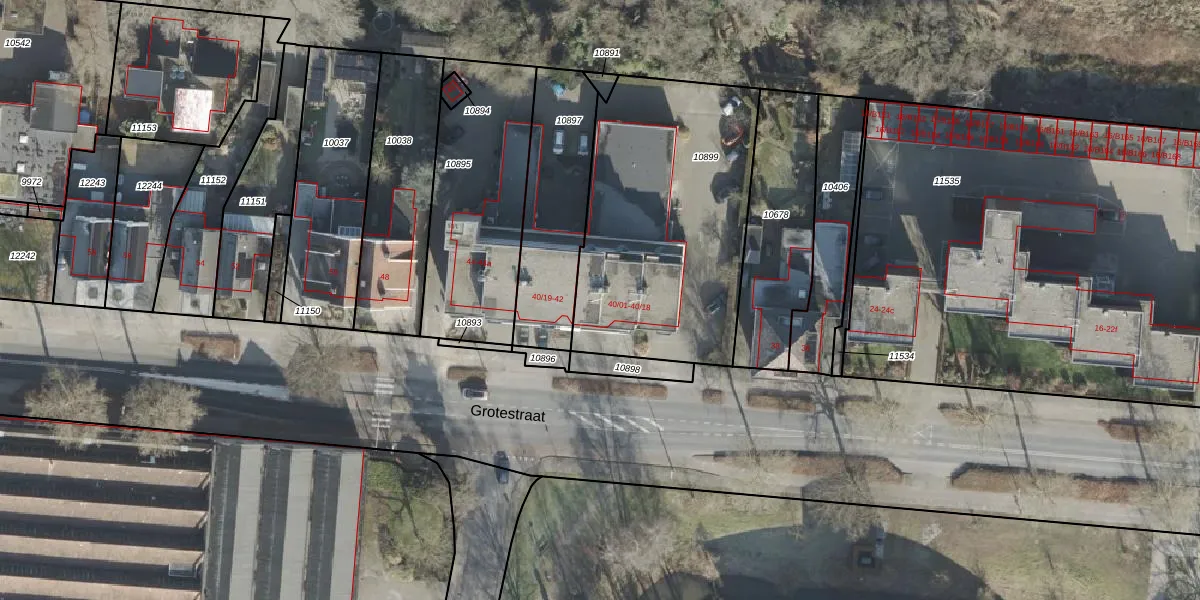 Het perceel waarop Grotestraat 40-01 staat heeft een oppervlakte van 1250 m². Dit is een zeer groot perceel. De perceeloppervlakte wordt geregistreerd door het Kadaster. Gedetailleerde informatie over de maten van dit perceel kunt u vinden in het rapport Kadastrale kaart met maatvoering van Grotestraat 40-01.