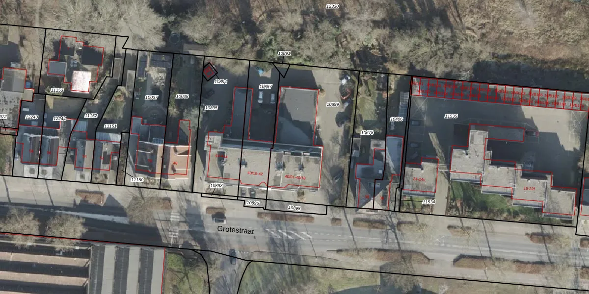 Het perceel waarop Grotestraat 40-06 staat heeft een oppervlakte van 1250 m². Dit is een zeer groot perceel. De perceeloppervlakte wordt geregistreerd door het Kadaster. Gedetailleerde informatie over de maten van dit perceel kunt u vinden in het rapport Kadastrale kaart met maatvoering van Grotestraat 40-06.