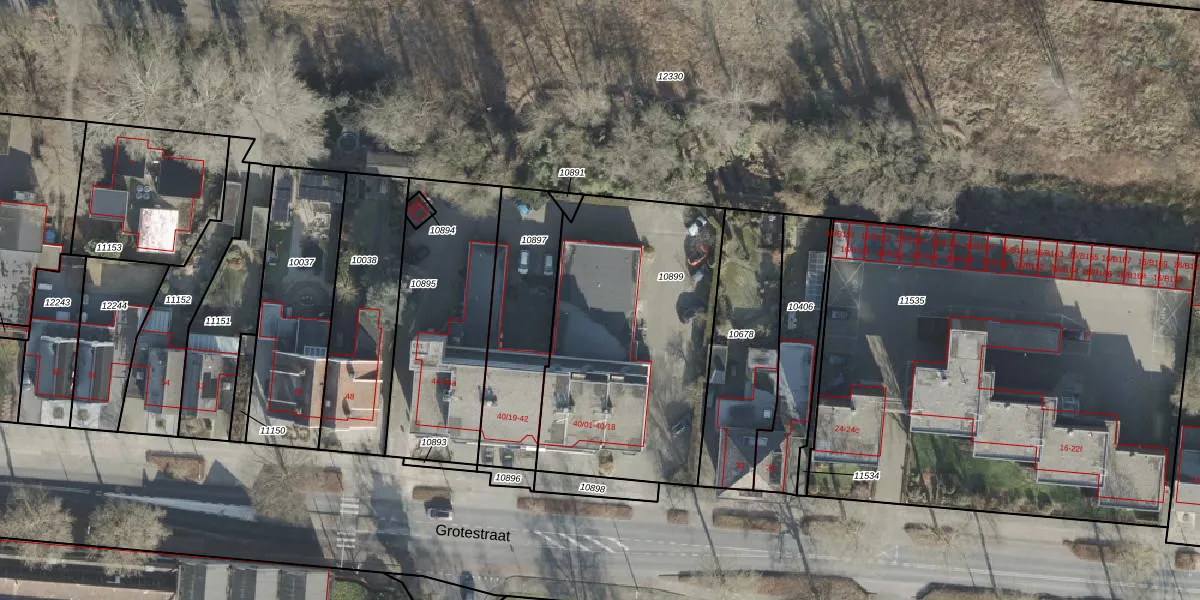 Het perceel waarop Grotestraat 40-13 staat heeft een oppervlakte van 1250 m². Dit is een zeer groot perceel. De perceeloppervlakte wordt geregistreerd door het Kadaster. Gedetailleerde informatie over de maten van dit perceel kunt u vinden in het rapport Kadastrale kaart met maatvoering van Grotestraat 40-13.