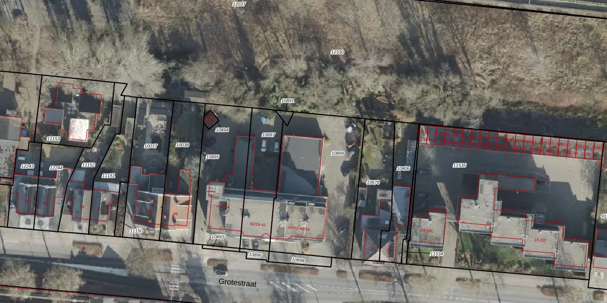 Het perceel waarop Grotestraat 40-16 staat heeft een oppervlakte van 1250 m². Dit is een zeer groot perceel. De perceeloppervlakte wordt geregistreerd door het Kadaster. Gedetailleerde informatie over de maten van dit perceel kunt u vinden in het rapport Kadastrale kaart met maatvoering van Grotestraat 40-16.
