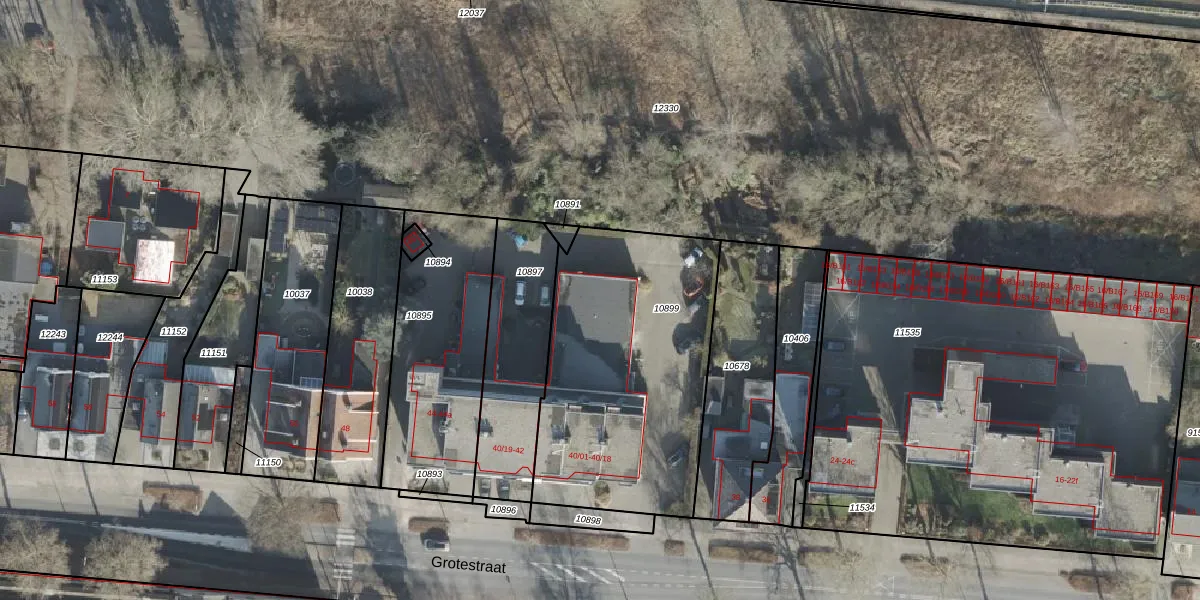 Het perceel waarop Grotestraat 40-17 staat heeft een oppervlakte van 1250 m². Dit is een zeer groot perceel. De perceeloppervlakte wordt geregistreerd door het Kadaster. Gedetailleerde informatie over de maten van dit perceel kunt u vinden in het rapport Kadastrale kaart met maatvoering van Grotestraat 40-17.