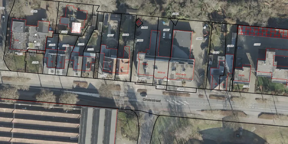 Het perceel waarop Grotestraat 44 staat heeft een oppervlakte van 708 m². Dit is een groot perceel. De perceeloppervlakte wordt geregistreerd door het Kadaster. Gedetailleerde informatie over de maten van dit perceel kunt u vinden in het rapport Kadastrale kaart met maatvoering van Grotestraat 44.