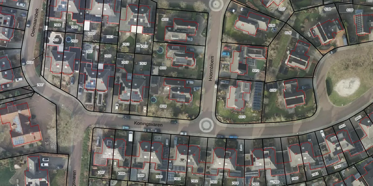 Het perceel waarop Hoornbloem 20 staat heeft een oppervlakte van 613 m². Dit is een groot perceel. De perceeloppervlakte wordt geregistreerd door het Kadaster. Gedetailleerde informatie over de maten van dit perceel kunt u vinden in het rapport Kadastrale kaart met maatvoering van Hoornbloem 20.