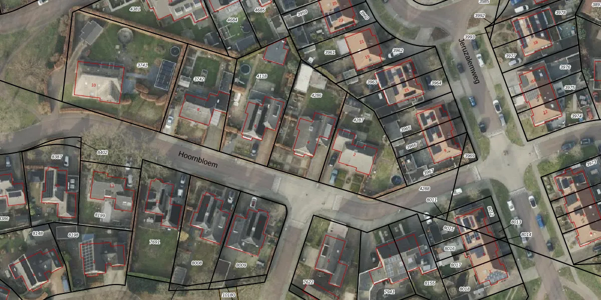 Het perceel waarop Hoornbloem 4 staat heeft een oppervlakte van 619 m². Dit is een groot perceel. De perceeloppervlakte wordt geregistreerd door het Kadaster. Gedetailleerde informatie over de maten van dit perceel kunt u vinden in het rapport Kadastrale kaart met maatvoering van Hoornbloem 4.