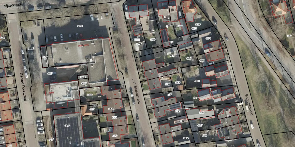Het perceel waarop Jan Steenstraat 1-a staat heeft een oppervlakte van 417 m². Dit is een groot perceel. De perceeloppervlakte wordt geregistreerd door het Kadaster. Gedetailleerde informatie over de maten van dit perceel kunt u vinden in het rapport Kadastrale kaart met maatvoering van Jan Steenstraat 1-a.