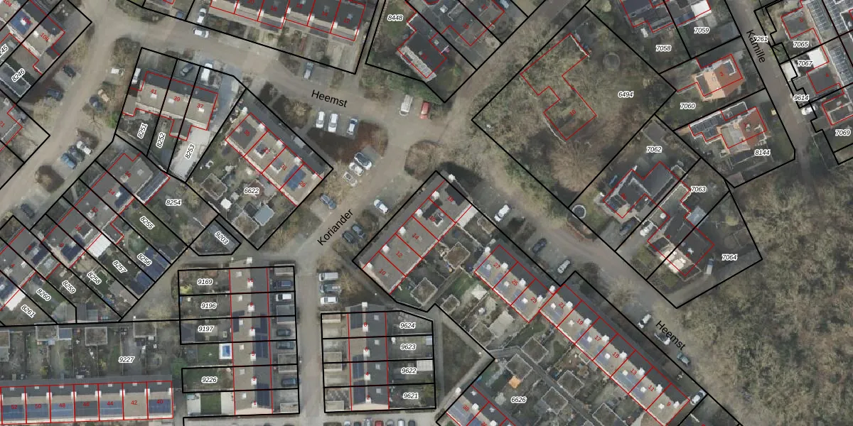 Het perceel waarop Koriander 16 staat heeft een oppervlakte van 3076 m². Dit is een zeer groot perceel. De perceeloppervlakte wordt geregistreerd door het Kadaster. Gedetailleerde informatie over de maten van dit perceel kunt u vinden in het rapport Kadastrale kaart met maatvoering van Koriander 16.