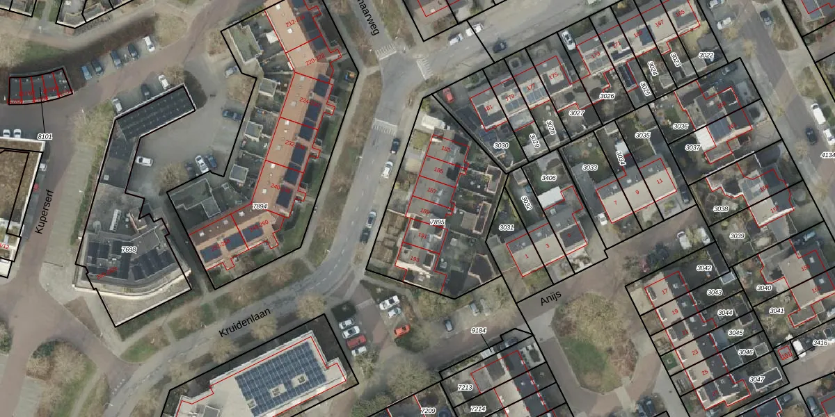Het perceel waarop Kruidenlaan 189 staat heeft een oppervlakte van 1013 m². Dit is een zeer groot perceel. De perceeloppervlakte wordt geregistreerd door het Kadaster. Gedetailleerde informatie over de maten van dit perceel kunt u vinden in het rapport Kadastrale kaart met maatvoering van Kruidenlaan 189.