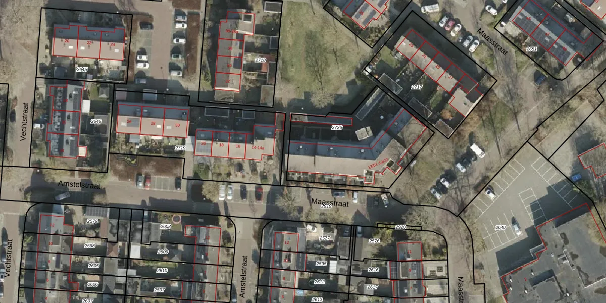 Het perceel waarop Maasstraat 13-11 staat heeft een oppervlakte van 1064 m². Dit is een zeer groot perceel. De perceeloppervlakte wordt geregistreerd door het Kadaster. Gedetailleerde informatie over de maten van dit perceel kunt u vinden in het rapport Kadastrale kaart met maatvoering van Maasstraat 13-11.