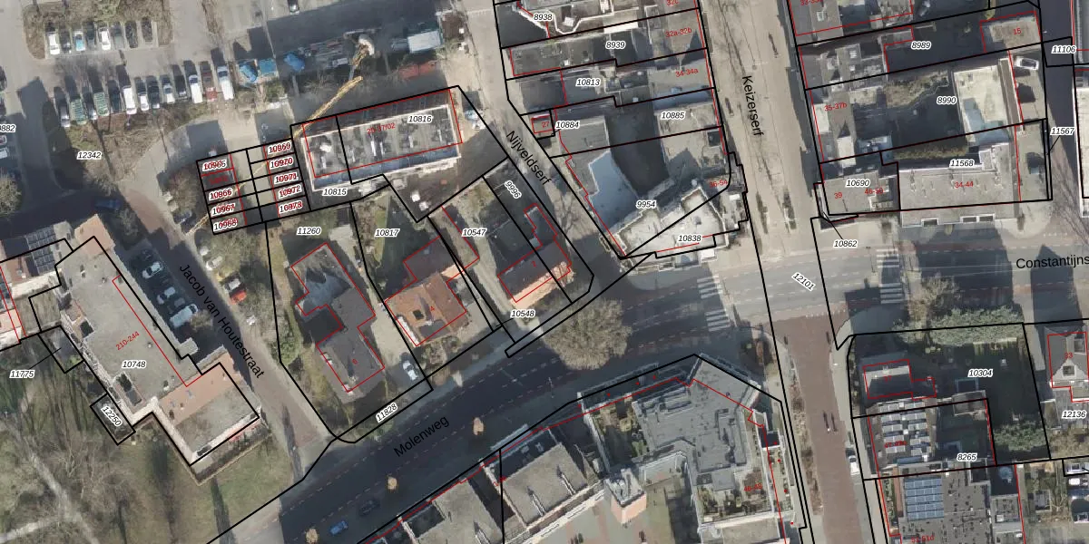 Gebruik de zoekbalk of klik op een perceel voor informatie over de adressen binnen dit perceel.
