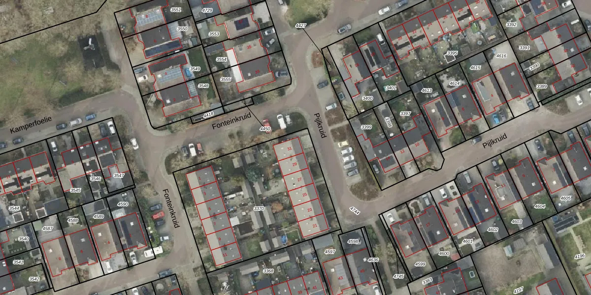 Het perceel waarop Pijlkruid 31 staat heeft een oppervlakte van 1733 m². Dit is een zeer groot perceel. De perceeloppervlakte wordt geregistreerd door het Kadaster. Gedetailleerde informatie over de maten van dit perceel kunt u vinden in het rapport Kadastrale kaart met maatvoering van Pijlkruid 31.