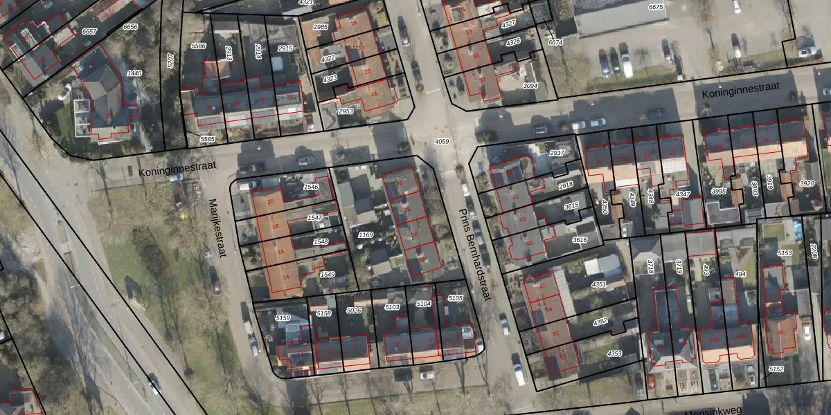 Het perceel waarop Prins Bernhardstraat 28 staat heeft een oppervlakte van 755 m². Dit is een groot perceel. De perceeloppervlakte wordt geregistreerd door het Kadaster. Gedetailleerde informatie over de maten van dit perceel kunt u vinden in het rapport Kadastrale kaart met maatvoering van Prins Bernhardstraat 28.