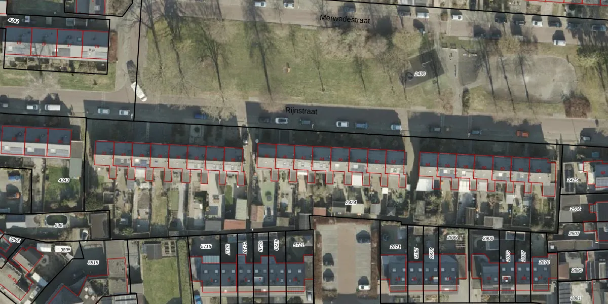 Het perceel waarop Rijnstraat 42 staat heeft een oppervlakte van 4950 m². Dit is een zeer groot perceel. De perceeloppervlakte wordt geregistreerd door het Kadaster. Gedetailleerde informatie over de maten van dit perceel kunt u vinden in het rapport Kadastrale kaart met maatvoering van Rijnstraat 42.