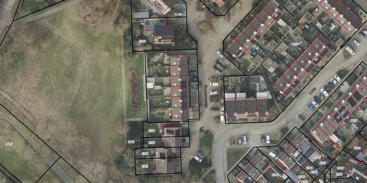 Het perceel waarop Rozemarijn 13 staat heeft een oppervlakte van 1102 m². Dit is een zeer groot perceel. De perceeloppervlakte wordt geregistreerd door het Kadaster. Gedetailleerde informatie over de maten van dit perceel kunt u vinden in het rapport Kadastrale kaart met maatvoering van Rozemarijn 13.