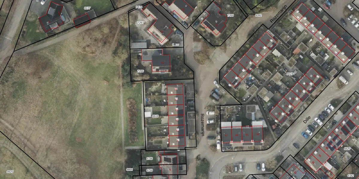Het perceel waarop Rozemarijn 19 staat heeft een oppervlakte van 1102 m². Dit is een zeer groot perceel. De perceeloppervlakte wordt geregistreerd door het Kadaster. Gedetailleerde informatie over de maten van dit perceel kunt u vinden in het rapport Kadastrale kaart met maatvoering van Rozemarijn 19.