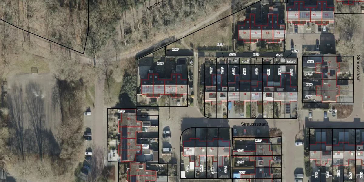 Het perceel waarop Straussstraat 23 staat heeft een oppervlakte van 751 m². Dit is een groot perceel. De perceeloppervlakte wordt geregistreerd door het Kadaster. Gedetailleerde informatie over de maten van dit perceel kunt u vinden in het rapport Kadastrale kaart met maatvoering van Straussstraat 23.