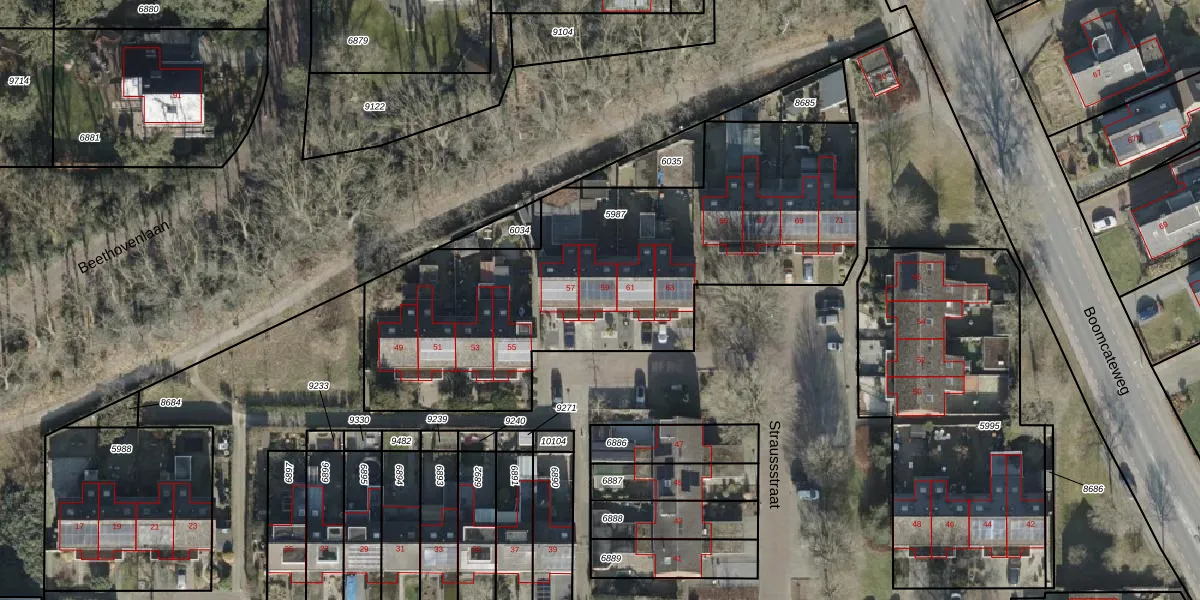 Het perceel waarop Straussstraat 59 staat heeft een oppervlakte van 2141 m². Dit is een zeer groot perceel. De perceeloppervlakte wordt geregistreerd door het Kadaster. Gedetailleerde informatie over de maten van dit perceel kunt u vinden in het rapport Kadastrale kaart met maatvoering van Straussstraat 59.