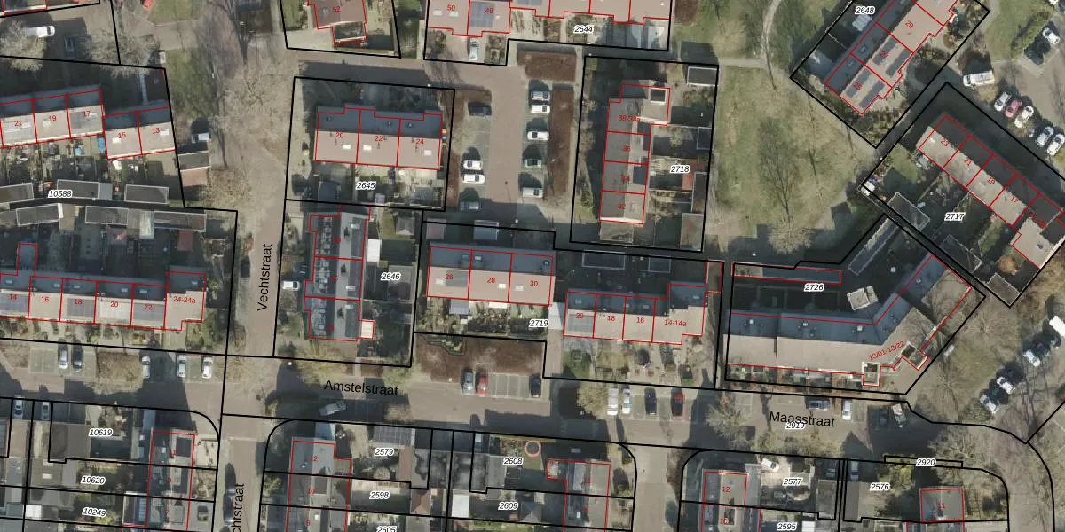 Het perceel waarop Vechtstraat 30 staat heeft een oppervlakte van 1290 m². Dit is een zeer groot perceel. De perceeloppervlakte wordt geregistreerd door het Kadaster. Gedetailleerde informatie over de maten van dit perceel kunt u vinden in het rapport Kadastrale kaart met maatvoering van Vechtstraat 30.