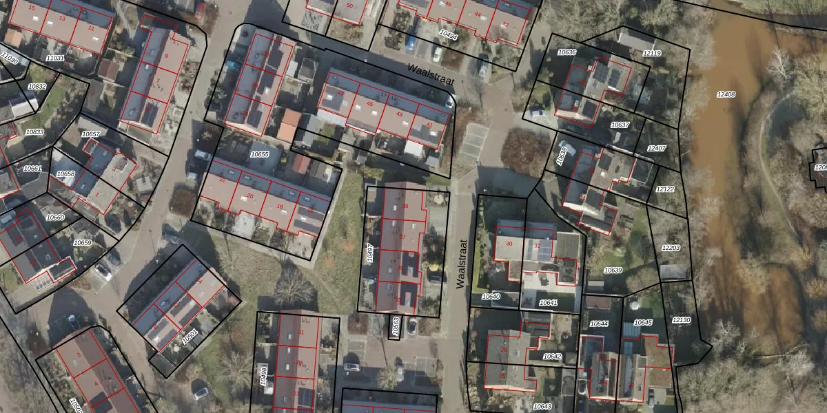 Het perceel waarop Waalstraat 39 staat heeft een oppervlakte van 613 m². Dit is een groot perceel. De perceeloppervlakte wordt geregistreerd door het Kadaster. Gedetailleerde informatie over de maten van dit perceel kunt u vinden in het rapport Kadastrale kaart met maatvoering van Waalstraat 39.
