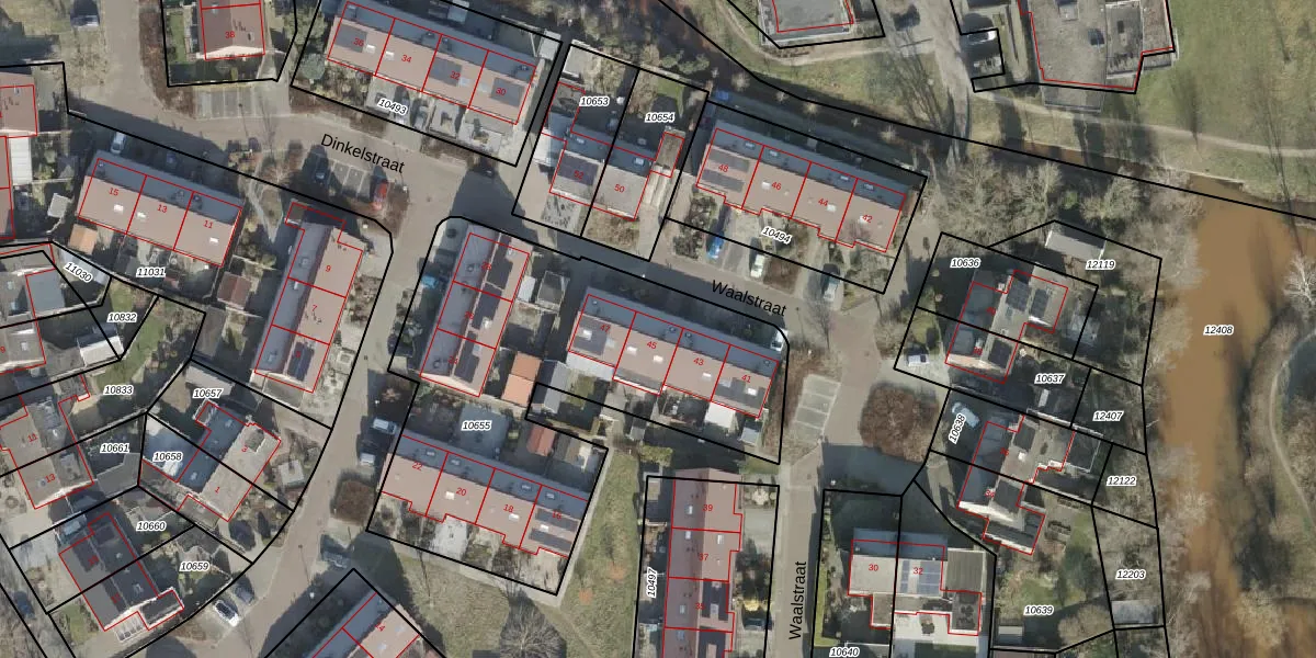 Het perceel waarop Waalstraat 45 staat heeft een oppervlakte van 2021 m². Dit is een zeer groot perceel. De perceeloppervlakte wordt geregistreerd door het Kadaster. Gedetailleerde informatie over de maten van dit perceel kunt u vinden in het rapport Kadastrale kaart met maatvoering van Waalstraat 45.