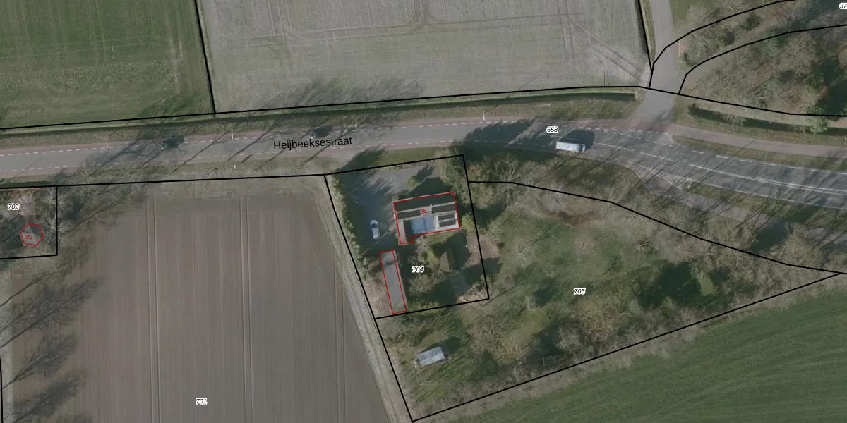 Heijbeeksestraat 36 is gelegen op kadastraal perceel RSD00R704. Deze kadastrale aanduiding is uniek en wordt gebruikt door het Kadaster om eigendomsrechten en andere zakelijke rechten vast te leggen. Het perceel maakt onderdeel uit van de kadastrale gemeente Roosendaal en Nispen.
