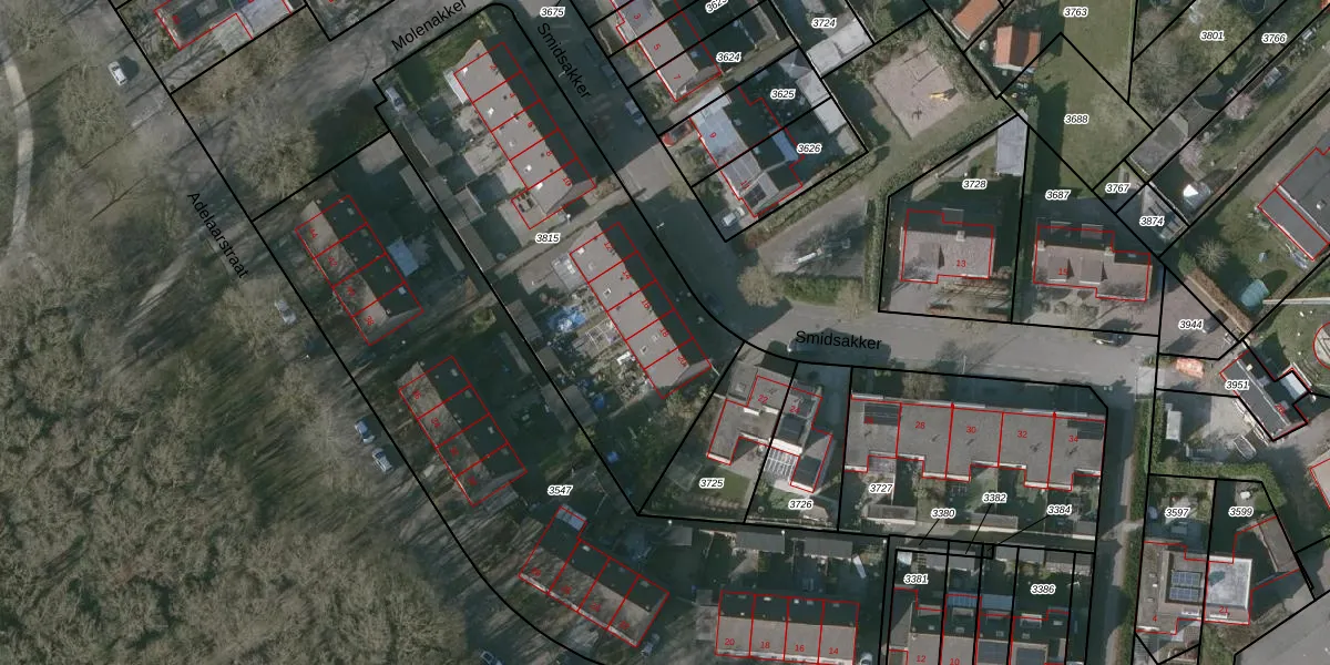 Het perceel waarop Smidsakker 18 staat heeft een oppervlakte van 1755 m². Dit is een zeer groot perceel. De perceeloppervlakte wordt geregistreerd door het Kadaster. Gedetailleerde informatie over de maten van dit perceel kunt u vinden in het rapport Kadastrale kaart met maatvoering van Smidsakker 18.