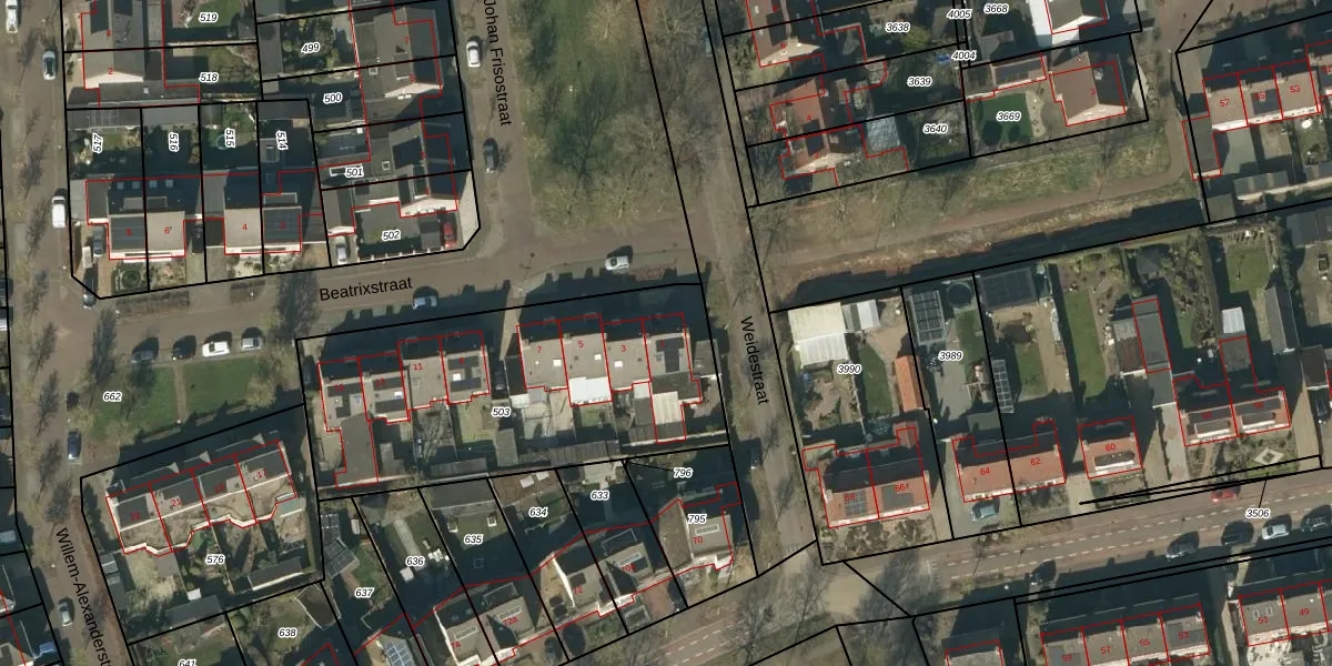 Het perceel waarop Beatrixstraat 1 staat heeft een oppervlakte van 1521 m². Dit is een zeer groot perceel. De perceeloppervlakte wordt geregistreerd door het Kadaster. Gedetailleerde informatie over de maten van dit perceel kunt u vinden in het rapport Kadastrale kaart met maatvoering van Beatrixstraat 1.