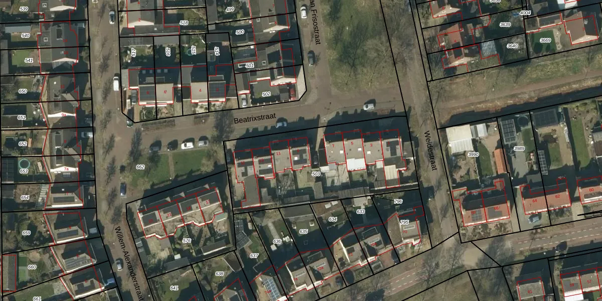 Het perceel waarop Beatrixstraat 9 staat heeft een oppervlakte van 1521 m². Dit is een zeer groot perceel. De perceeloppervlakte wordt geregistreerd door het Kadaster. Gedetailleerde informatie over de maten van dit perceel kunt u vinden in het rapport Kadastrale kaart met maatvoering van Beatrixstraat 9.