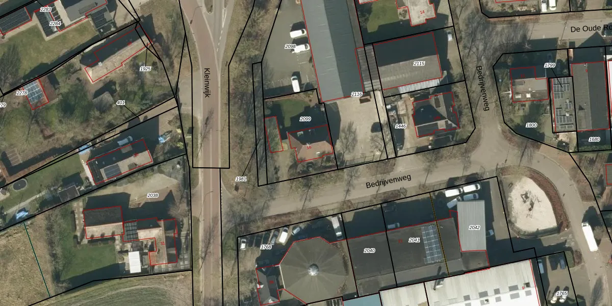 Het perceel waarop Bedrijvenweg 16 staat heeft een oppervlakte van 577 m². Dit is een groot perceel. De perceeloppervlakte wordt geregistreerd door het Kadaster. Gedetailleerde informatie over de maten van dit perceel kunt u vinden in het rapport Kadastrale kaart met maatvoering van Bedrijvenweg 16.