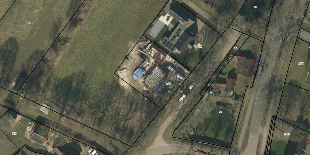 Het perceel waarop Dintherseweg 2-b staat heeft een oppervlakte van 1200 m². Dit is een zeer groot perceel. De perceeloppervlakte wordt geregistreerd door het Kadaster. Gedetailleerde informatie over de maten van dit perceel kunt u vinden in het rapport Kadastrale kaart met maatvoering van Dintherseweg 2-b.