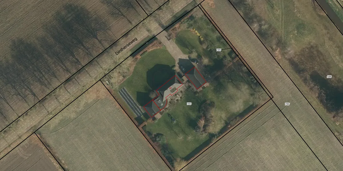 Het perceel waarop Dintherseweg 41 staat heeft een oppervlakte van 5055 m². Dit is een zeer groot perceel. De perceeloppervlakte wordt geregistreerd door het Kadaster. Gedetailleerde informatie over de maten van dit perceel kunt u vinden in het rapport Kadastrale kaart met maatvoering van Dintherseweg 41.