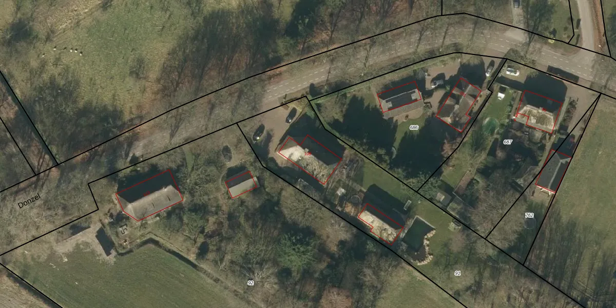Het perceel waarop Donzel 109 staat heeft een oppervlakte van 3090 m². Dit is een zeer groot perceel. De perceeloppervlakte wordt geregistreerd door het Kadaster. Gedetailleerde informatie over de maten van dit perceel kunt u vinden in het rapport Kadastrale kaart met maatvoering van Donzel 109.