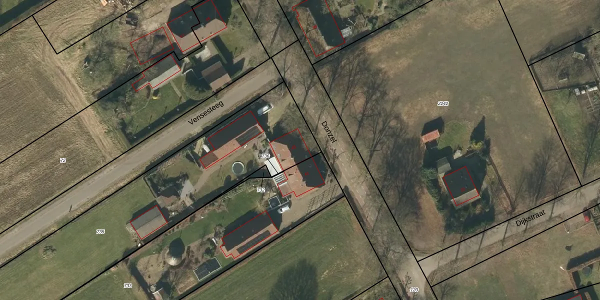 Het perceel waarop Donzel 43 staat heeft een oppervlakte van 3149 m². Dit is een zeer groot perceel. De perceeloppervlakte wordt geregistreerd door het Kadaster. Gedetailleerde informatie over de maten van dit perceel kunt u vinden in het rapport Kadastrale kaart met maatvoering van Donzel 43.